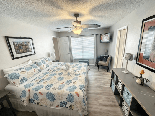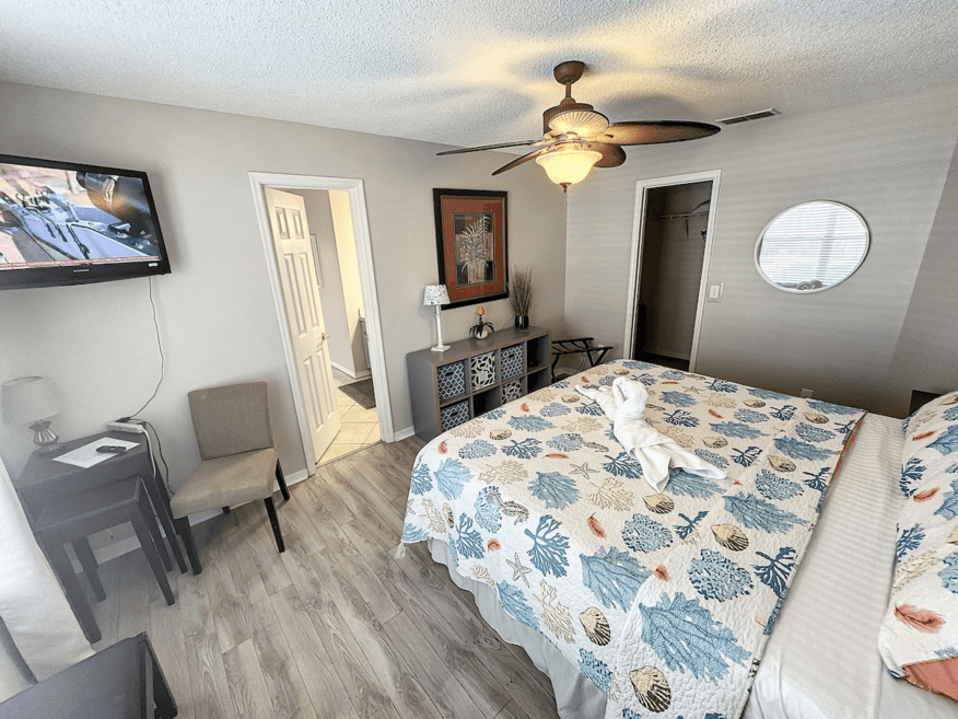 MASTER BEDROOM. Our Master Suite Offers: poolside view, A giant new King bed to allow for a fantastic night’s sleep. A spacious en-suite bathroom complete with walk in shower & a separate garden tub.