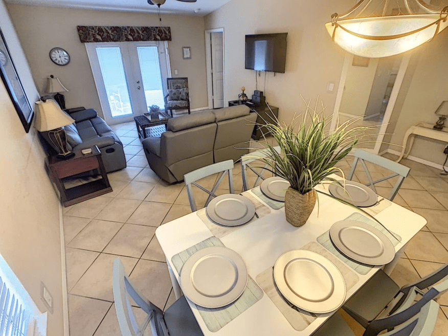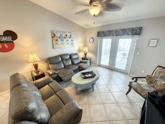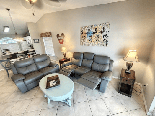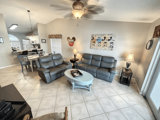 LIVING AREA. The living room overlooks the pool area, with its high vaulted ceilings , it is very spacious. Relax on our New sofas with recliners while you watch the large screen ROKU Smart TV
