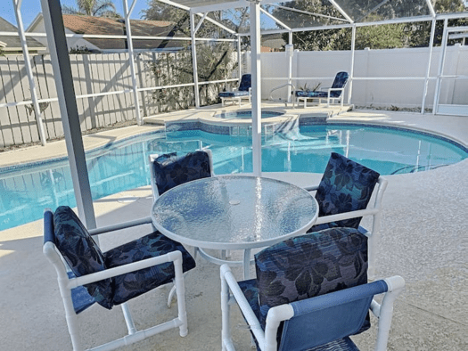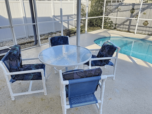 Outdoor dining table and sun loungers await in the fully private , fully fenced pool area . Pets can go outside of the screened in pool area