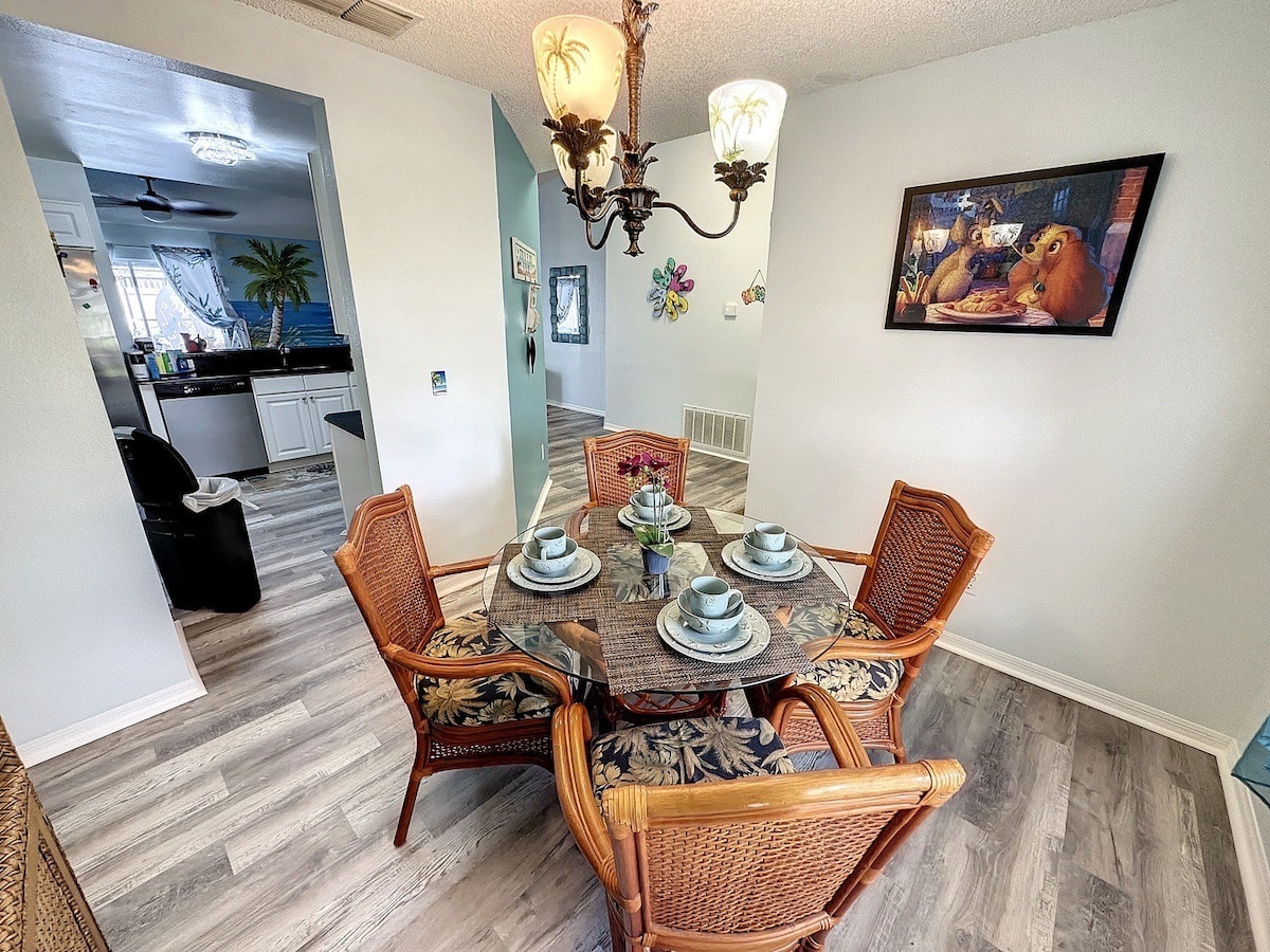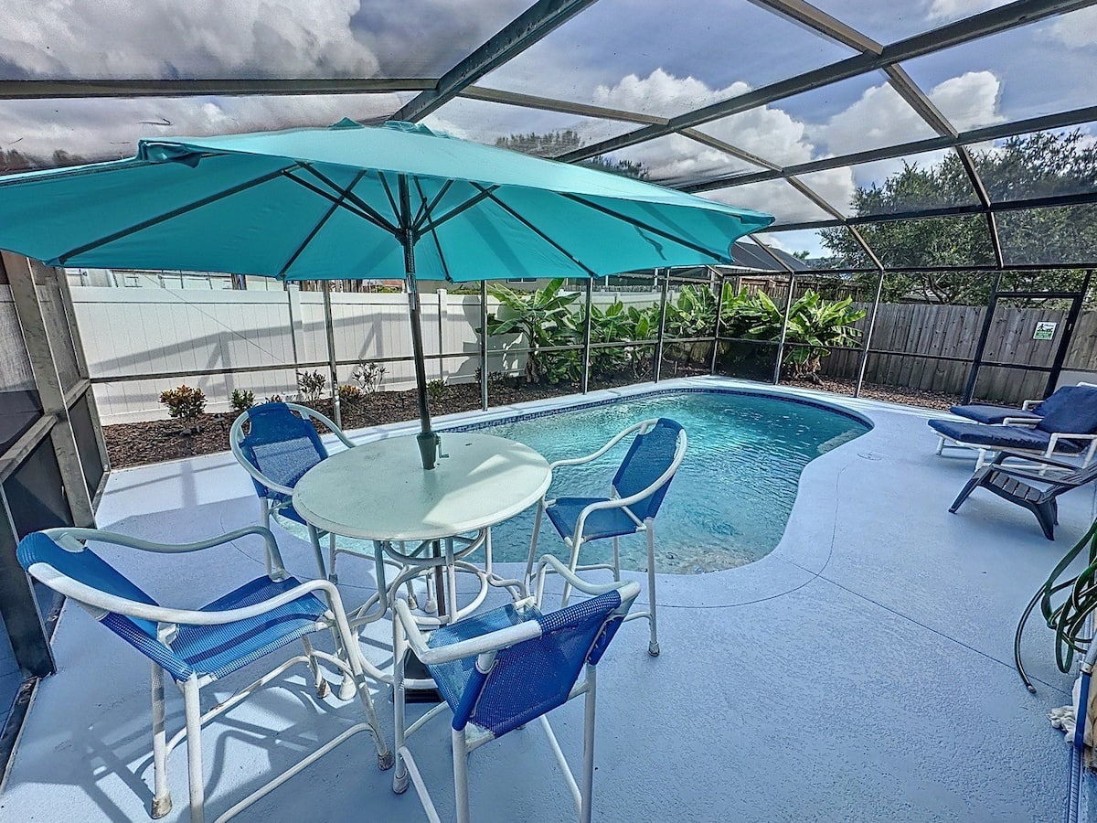 The living room has a 55” flat screen TV. This open floor plan allows everyone to be together in the living area, whether they are sitting on the couches or up at the bar. The kitchen has granite countertops. When dinner time rolls around, everyone can gather around the dining room table in the separate dining room, , or take it outside by the pool. When you’re not out enjoying the parks, you’ll want to be soaking up the sun in this private swimming pool. The pool is completely fenced in for privacy, has a covered patio and a Boardwalk/sun deck!