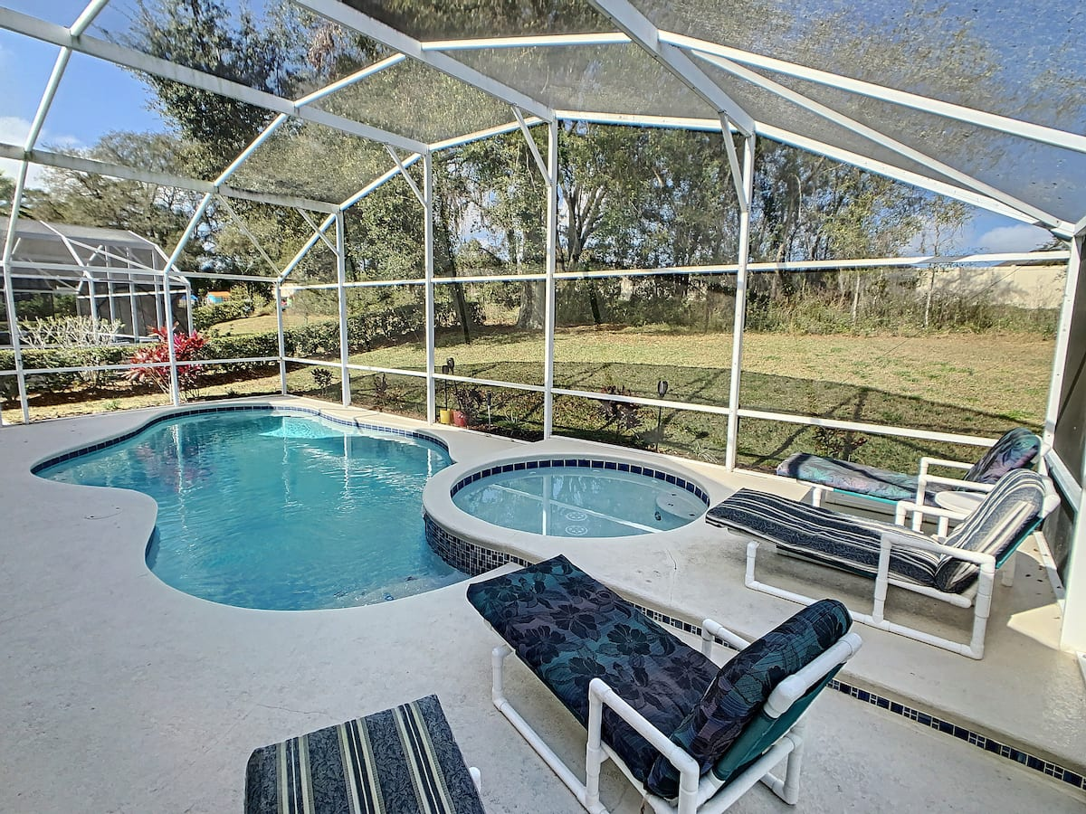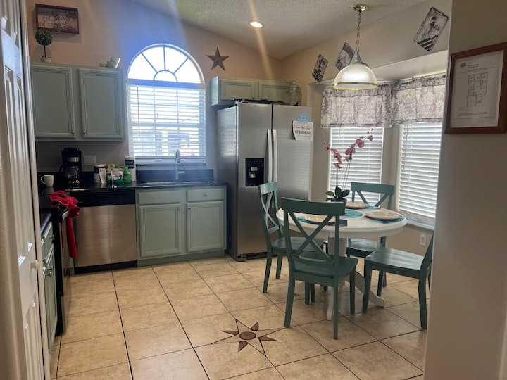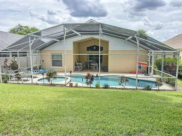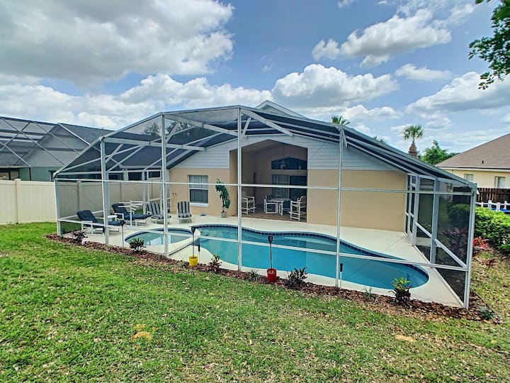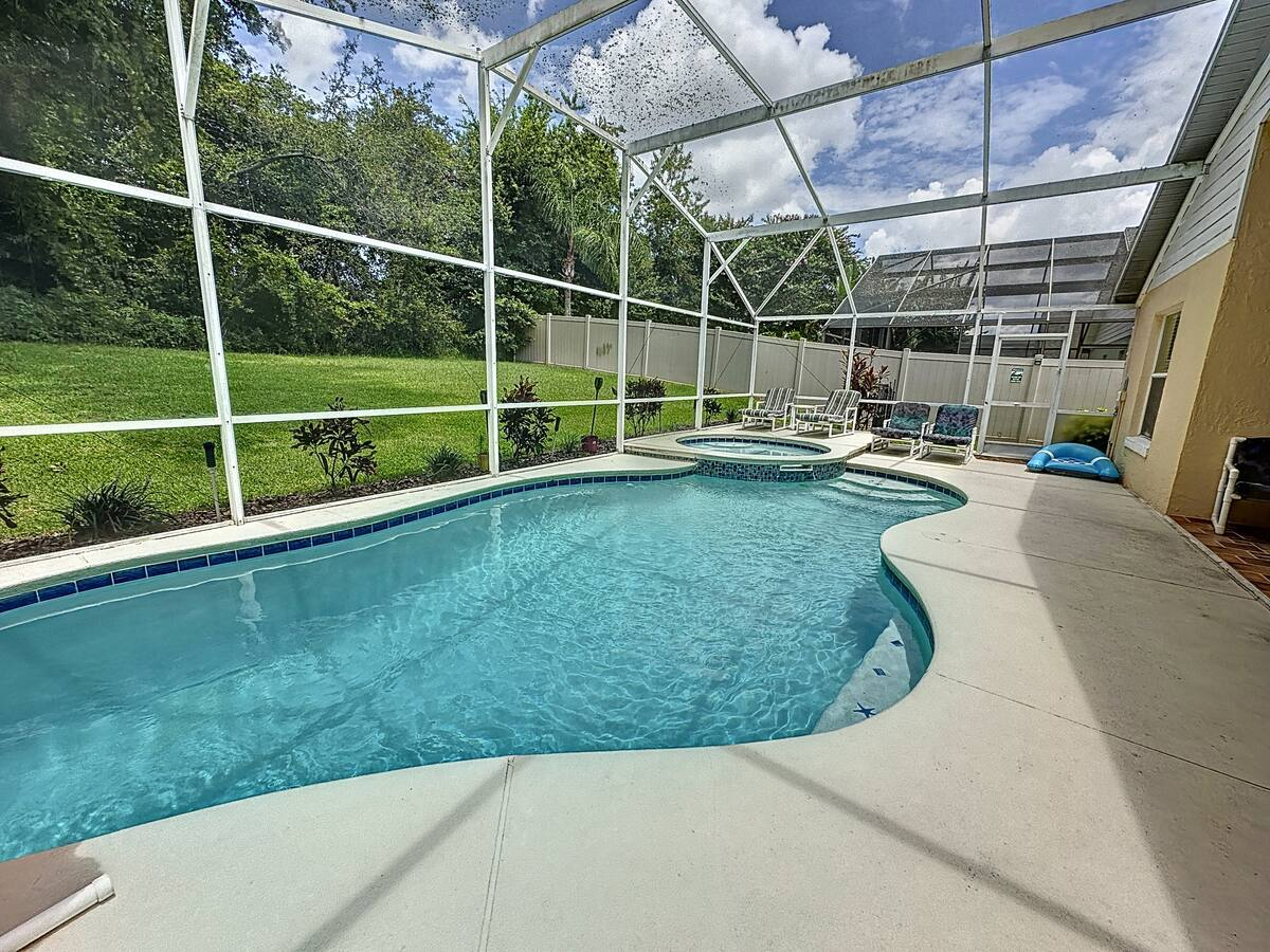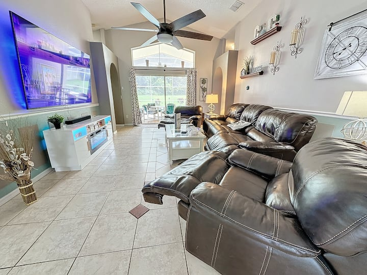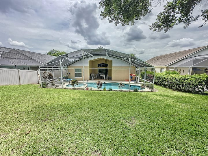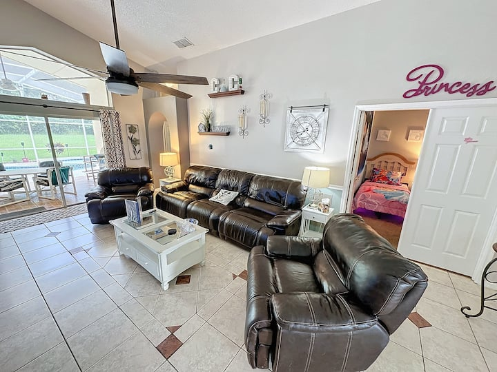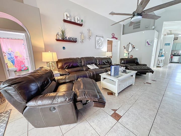 Updated July , themed home. 4 bed 2 bath , private pool, spa, Newly decorated Game Room includes pool table , Barbie playhouse ,arcade game , boys toys , large tv and recliners and more. Only 4 miles to Disney, pets allowed dedicated dog run. 86 inch TV just added