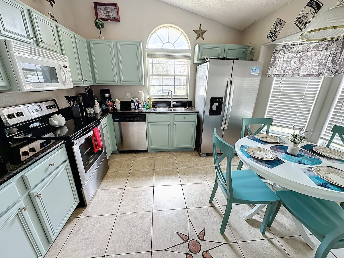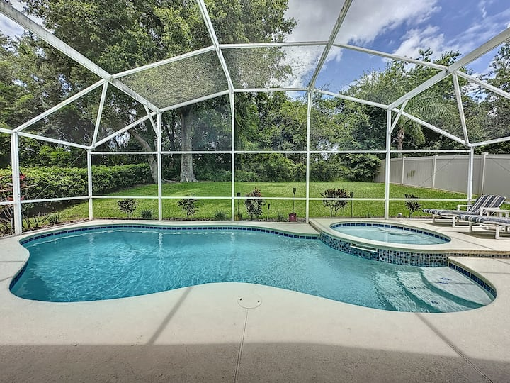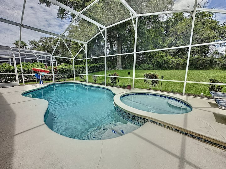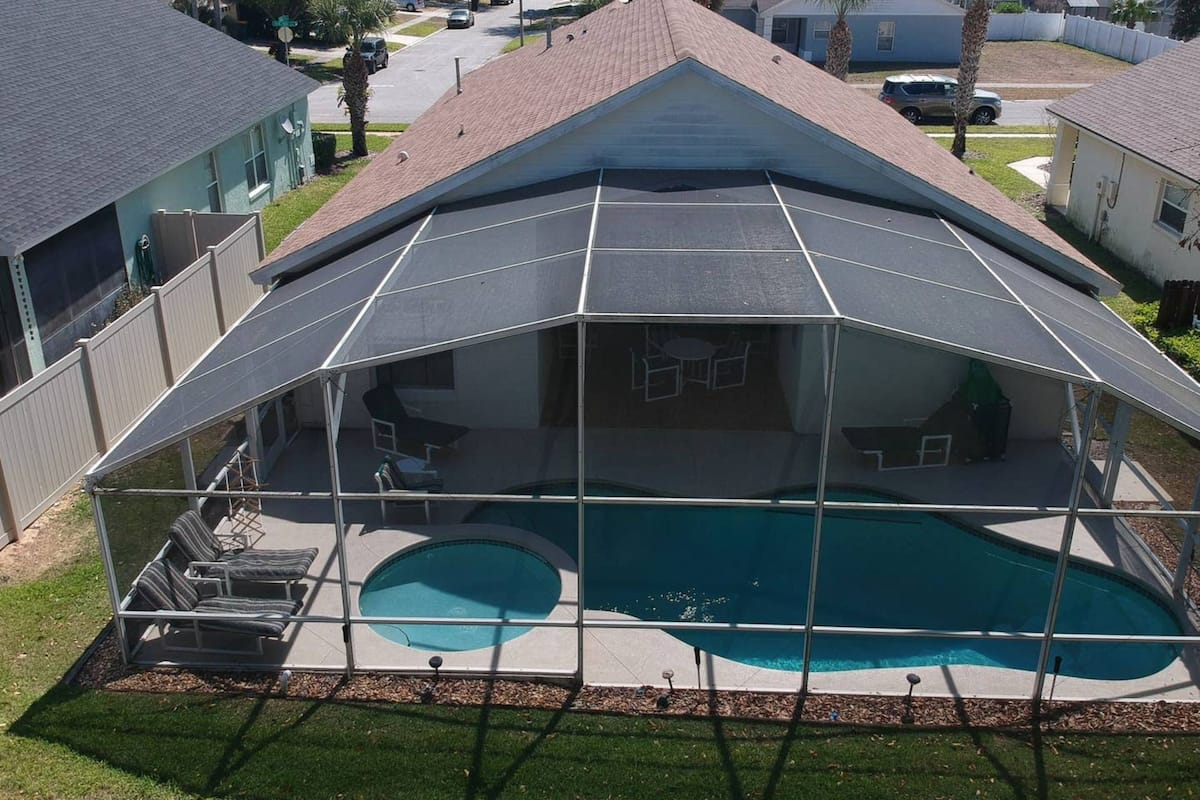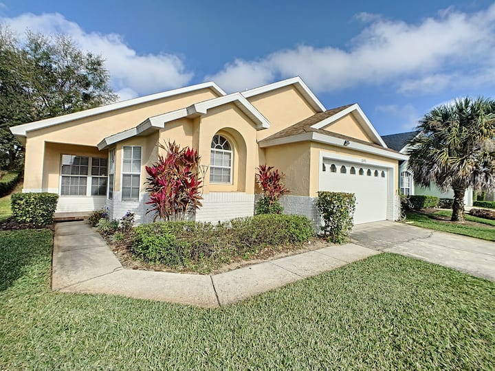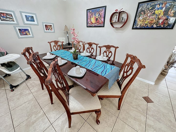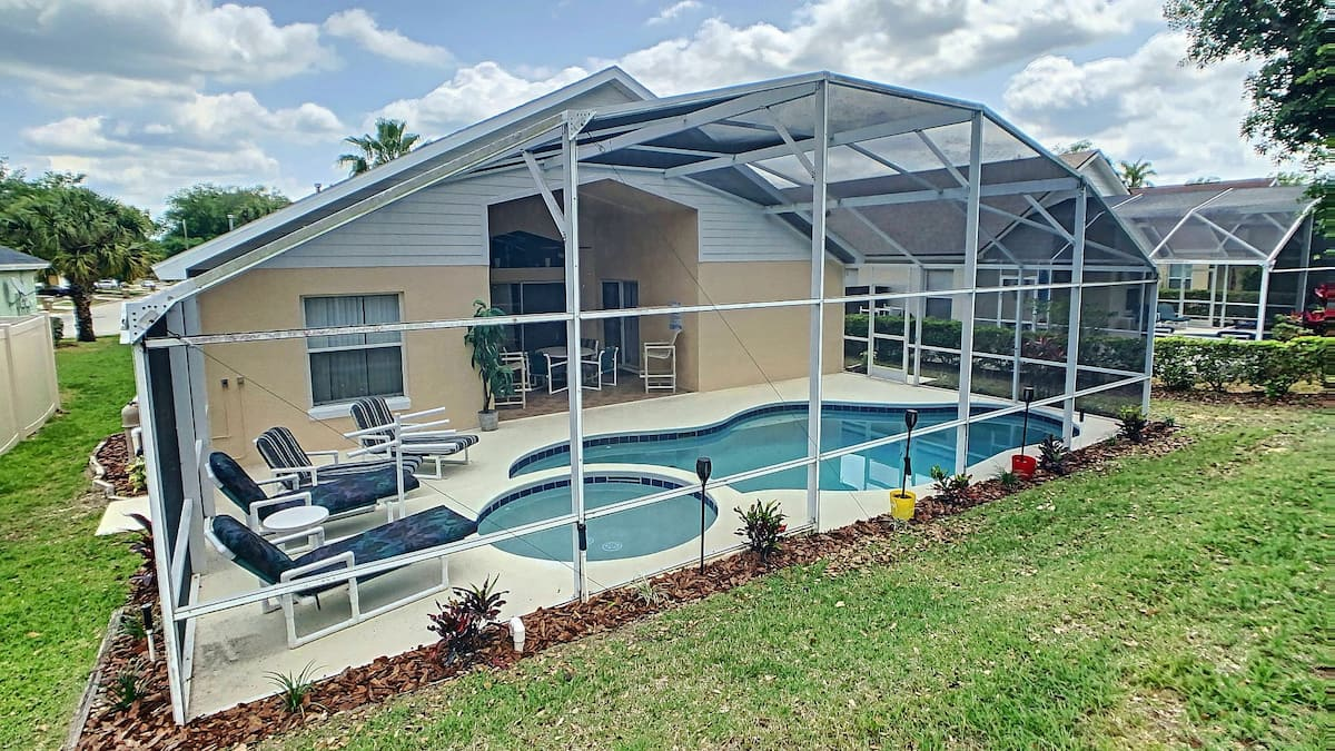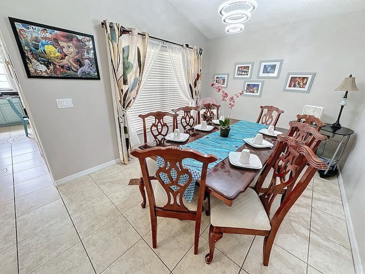 Updated July , themed home. 4 bed 2 bath , private pool, spa, Newly decorated Game Room includes pool table , Barbie playhouse ,arcade game , boys toys , large tv and recliners and more. Only 4 miles to Disney, pets allowed dedicated dog run. 86 inch TV just added