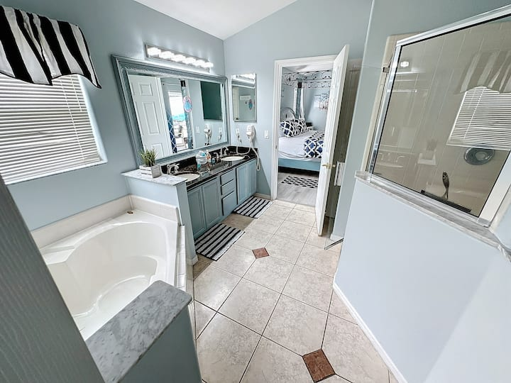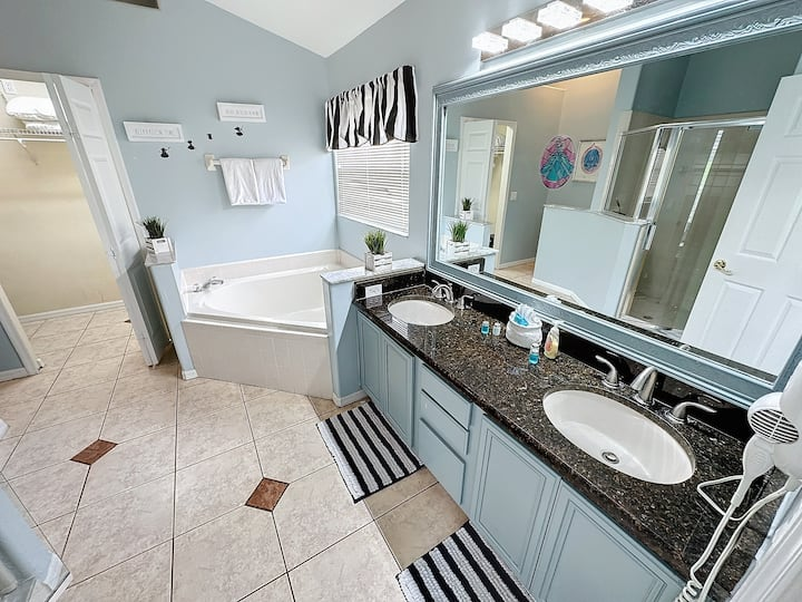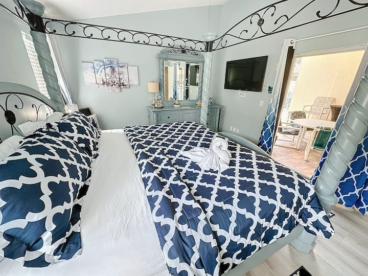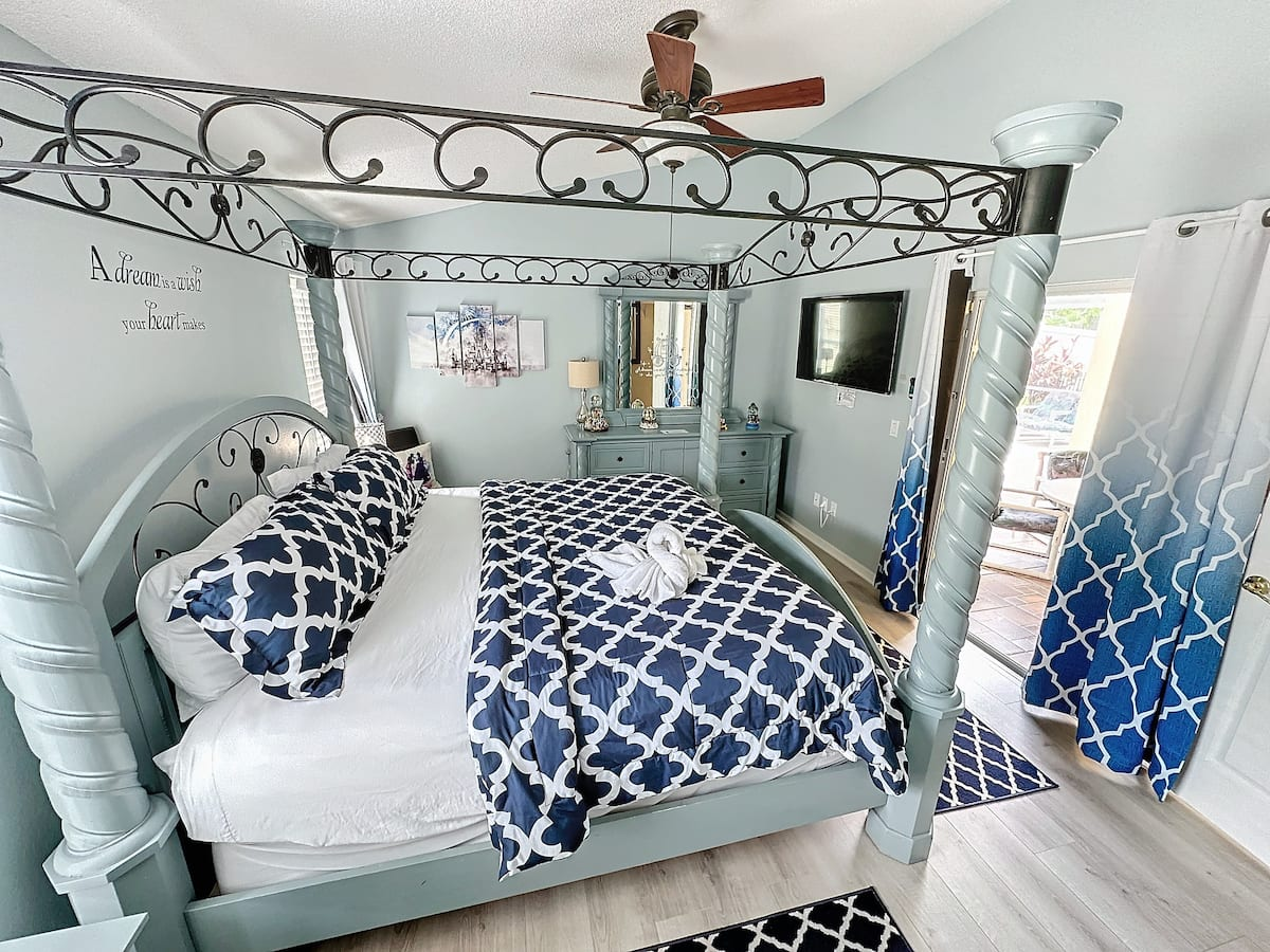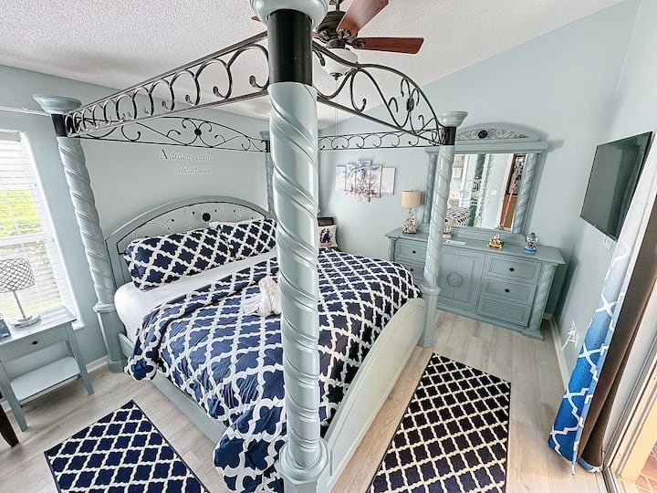 Royal Family Sleeping Quarters In other vacation homes they may refer to these rooms as bedrooms, but here they are so much more than that! Spacious and fully furnished areas for the busy family to rest and relax in privacy. Enjoy the recently updated king size four poster bed, TV and private bathroom with heart shaped tub for two and a separate large shower in the Master Suite. You’ll also be able to step outside to the pool, with your own private door to the patio!