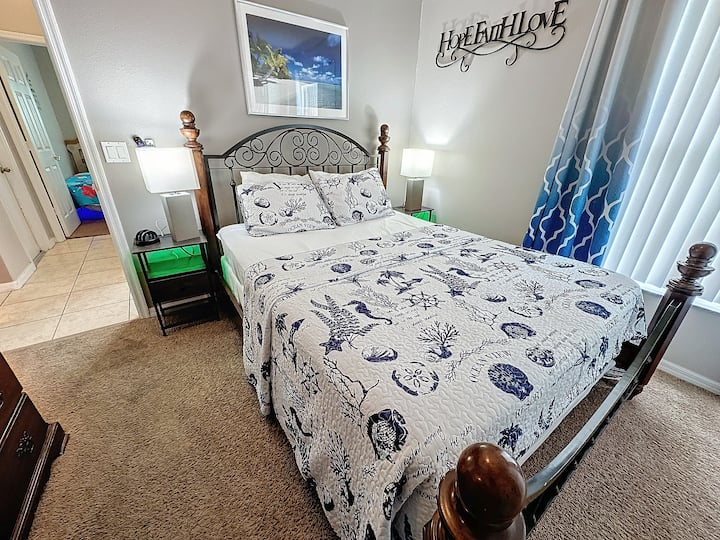 The second bedroom has a comfortable queen size bed and flat screen TV.