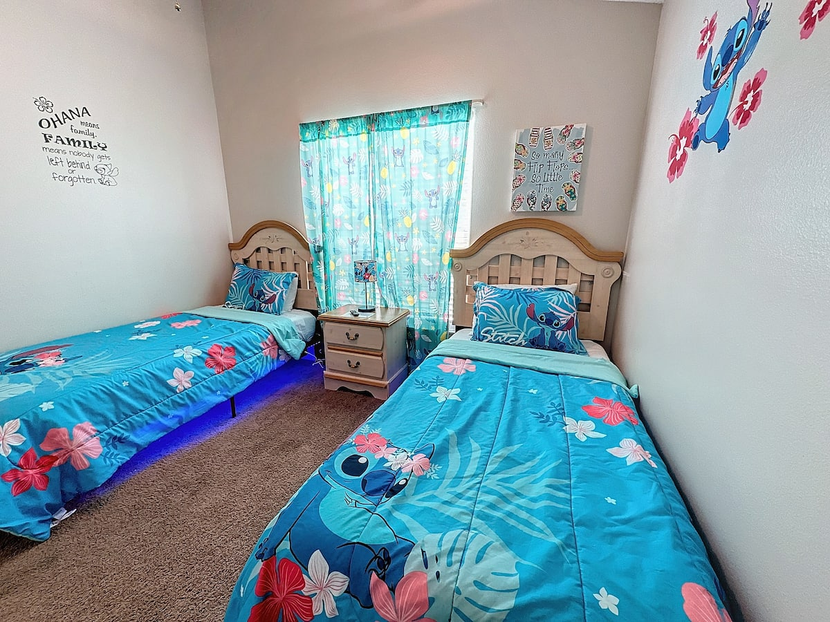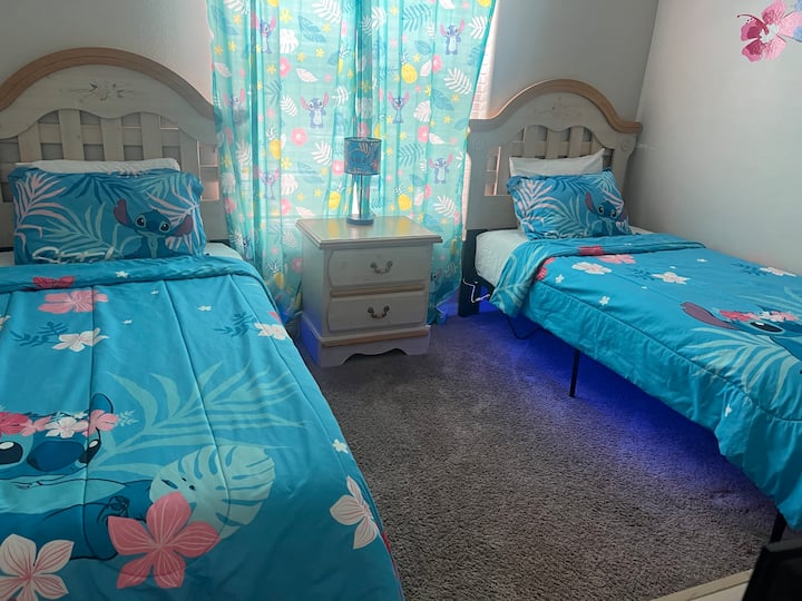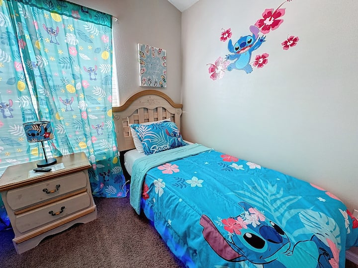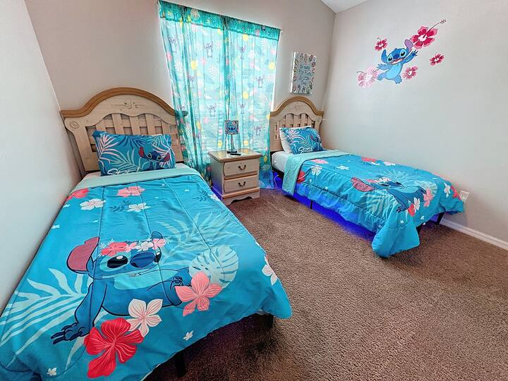 The fourth bedroom has two twin beds and TV. The room features Stitch and friends!