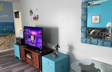 QUEEN BEDROOM. The Poolside Queen bedroom is just steps away from the family bathroom and has its own Smart TV and a ceiling fan.